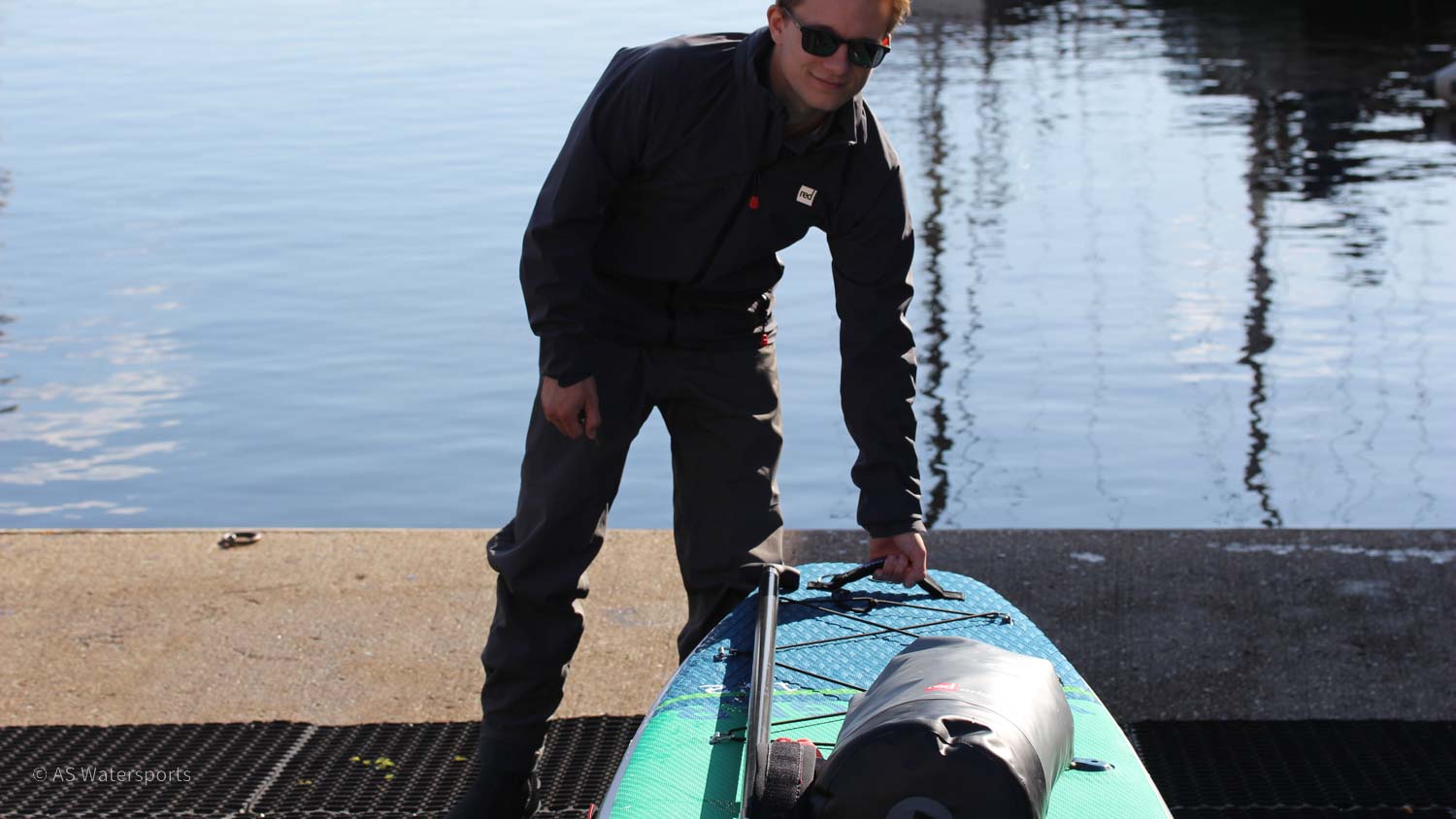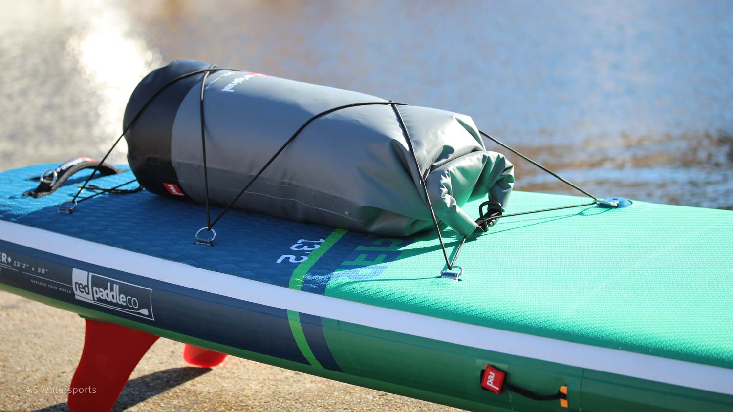 You can use the 6 point cargo tie-down system at the front to hold a couple of drybags, or clip on the 100% waterproof Red Original Deck Bag! The 4 point cargo tie-down system with extra grips at the back is plenty of space for a big drybag for a tent and accessories.