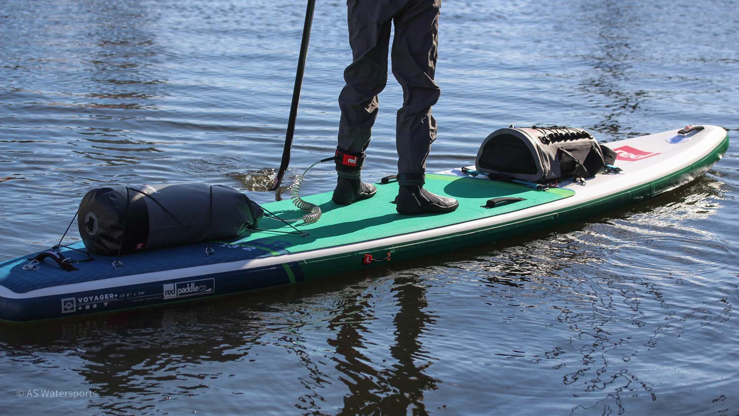 Staff member Dans pick of the range, the Red Paddle Co 13'2" Voyager Plus is a super sleek touring board with space to take everything with you, even the kitchen sink! Great for quick jaunts on the ocean, or load it up for multi-day trips. New for 2022: ADJUSTABLE CARGO SYSTEM A new and improved cargo system for the Voyager range offers three adjustable bungee straps. A twin d-ring locking system allows easy adjustment and release and the small loop is ideal for water bottle storage. A reinforced cargo point means you can strap on enough cargo for any adventure. ATB TRANSFORMER BAG Introducing a total redesign of the all terrain backpack that now offers a bagless carry system. This skeleton system means you can access more remote waterways without the need for a bulky bag and just take the straps and your pump. When using the bag, large all terrain wheels make handling rugged terrain a breeze and considered anthropometric design is able to be fully customised to your height so you can take maximum care of your body while under load. Large exterior pockets can fit any quick to grab essentials and velcro interior pocket means your paddle blade is safe and secure. The interior material has a stylish Red repeater pattern and it's water resistance will minimise any intrusive damp. Additional internal storage for small items and keeping your service kit on hand. The Revolutionary V-Hull. By cleverly tapering the cut of the drop stitch, the new displacement V-shaped hull on the nose of the Voyager breaks the surface tension of the water and keeps you gliding through your paddle stroke. The board slices through the water with ease and increased speed. This is a real game changer! Scientifically proven to improve efficiency compared to a flat hulled board, the V-Hull Voyager helps you paddle for longer with less effort. Another bonus is that the concave nose of the upper deck also creates more space under the bungees for all your gear. The Twin Fin. Red introduced a twin fin set up on the 2021 Voyager board range – improving tracking and glide. By having two shorter fins rather than one longer fin, you’ll be able to get into much shallower waters, opening up a wider variety of waterways to paddle. Another benefit is that you can load your board with all of your gear and it will remain super stable. It won’t rock from side to side as you would find with one fin. The 13'2 length allows this Voyager to gain speed quickly, while the 30" width lets the board glide over the water without losing much in the way of stability. The pointed nose cuts through the chop and the rear gives space for gear. You can use the 6 point cargo tie-down system at the front to hold a couple of drybags, or clip on the 100% waterproof Red Original Deck Bag! The 4 point cargo tie-down system with extra grips at the back is plenty of space for a big drybag for a tent and accessories. Multiple carry handles ensure that carrying around obstacles is a breeze, no matter how much gear you have on board. IMPROVED RSS BATTENS Now in a bright colour so they cannot be forgotten at set up, rounded leading edge for improved ease of insertion and new pure material which is more durable and also recyclable. Who's it for? Life’s adventurers – take all your kit on your next expedition Calling all life’s adventurers… The Red Paddle 13.2 Voyager+ inflatable SUP was created with epic adventures in mind and is the board of choice of many extreme explorers around the world. . The Package The Technology The Warranty Why buy from AS Watersports?