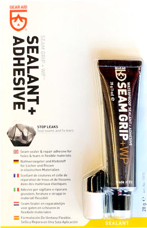 McNett Gear Aid Seam Grip + WP - Ideal adhesive & waterproof repair sealant for most flexible and nylon products such as membrane suits, dry cags etc. Stops Leaks, Seals Seams and Fixes Tears 28 Gram tube with brush attachment included.